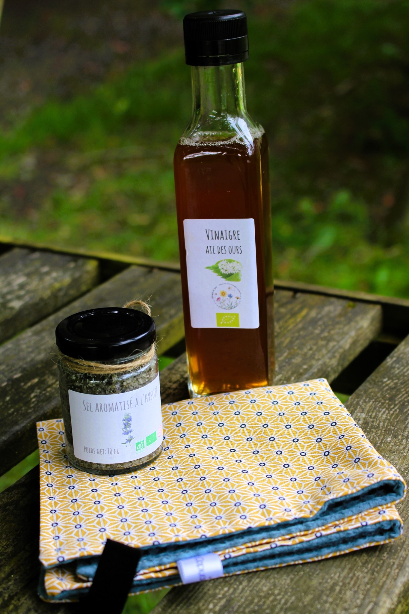 Un coffret original pour les fêter, avec un sel aromatisé, un vinaigre à l’ail des ours de @Grain-es de Sève et un essuie main @BleuCapucine en coton et éponge nid d’abeille certifiés oeko tex