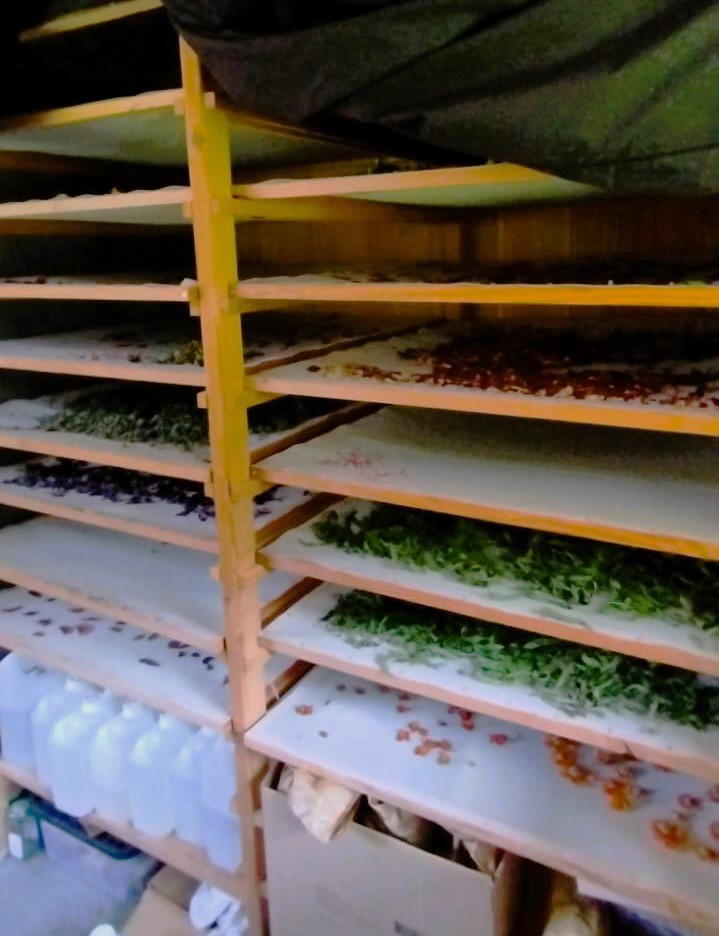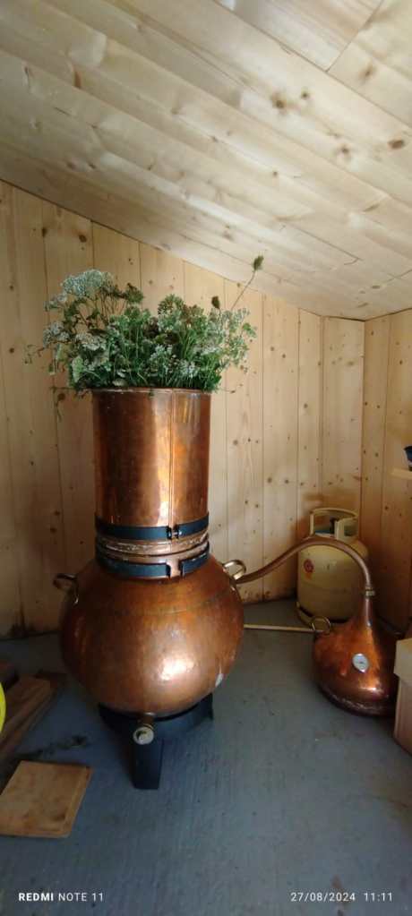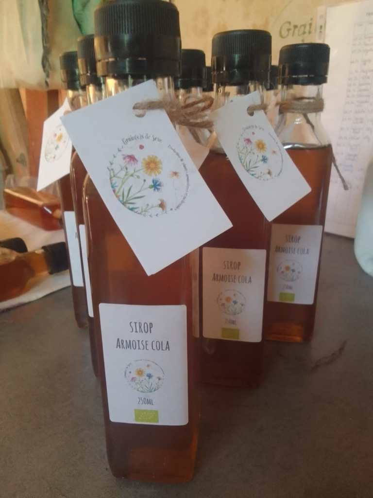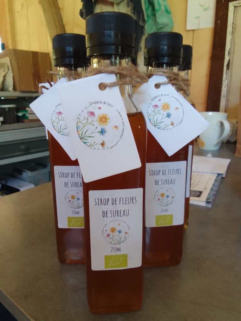 Jour 2 : Cueillette sauvage de l’Achillée millefeuille (qui a eu pour effet d’intriguer la vieille dame qui vit en haut de la montagne), distillation, cueillette de la verveine citronnée dans la serre et mise au séchoir, confection du sirop d’armoise cola pour concurrencer le numéro 1 mondial (blague) et d’un sirop de fleurs de sureau.