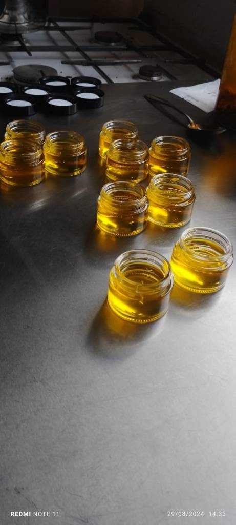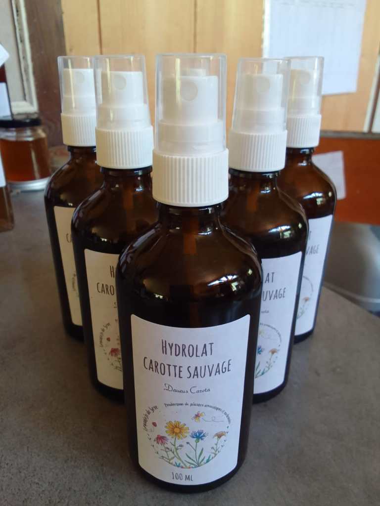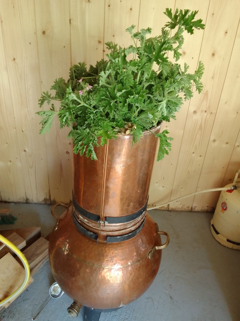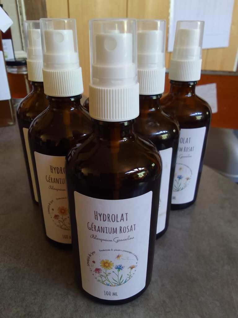Bouturage, nettoyage des plants, cueillette du géranium rosat si enivrant, distillation du fameux géranium, conditionnement des hydrolats de géranium (toujours) et de carotte sauvage, étiquetage et préparation d’un vinaigre aromatisé au romarin et un autre à l’estragon pour les amoureux de l’anis.